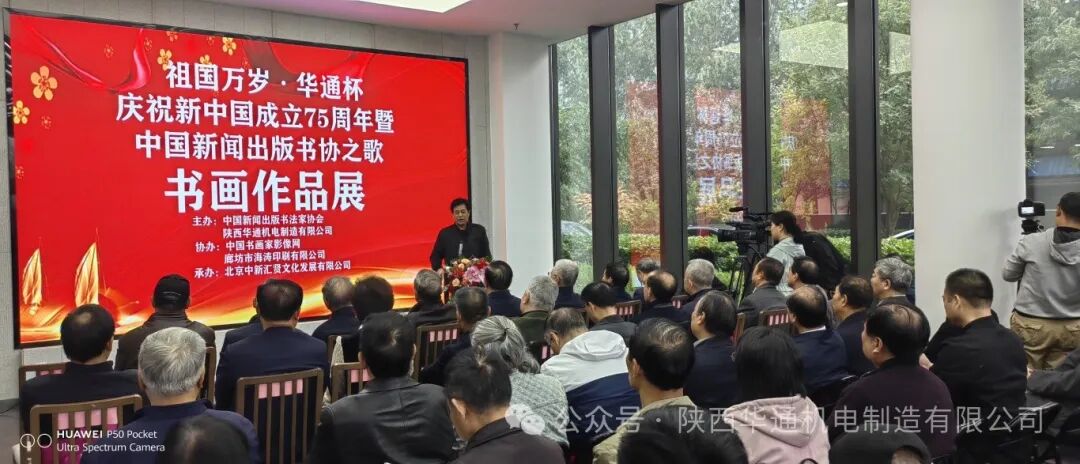 10月26日,由中国新闻出版书法家协会、陕西华通机电制造有限公司联袂举办的“祖国万岁--华通杯•庆祝新中国成立75周年暨中国新闻出版书协之歌书画作品展”在北京人美美术馆举行。我公司董事长王曙光及唐天标上将,王良旺、王兆海中将,马清云、马誉炜、苗爱民、董文久、段共生少将和各界知名人士及书画家近二百人出席了开幕式。