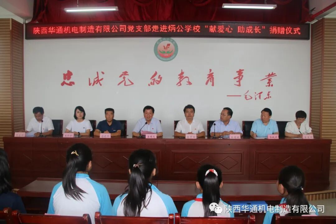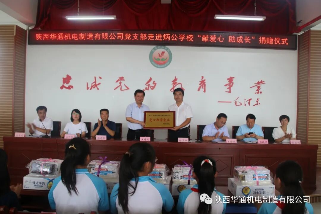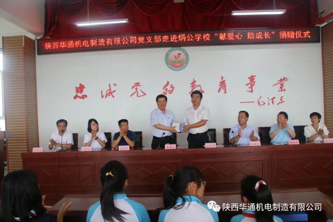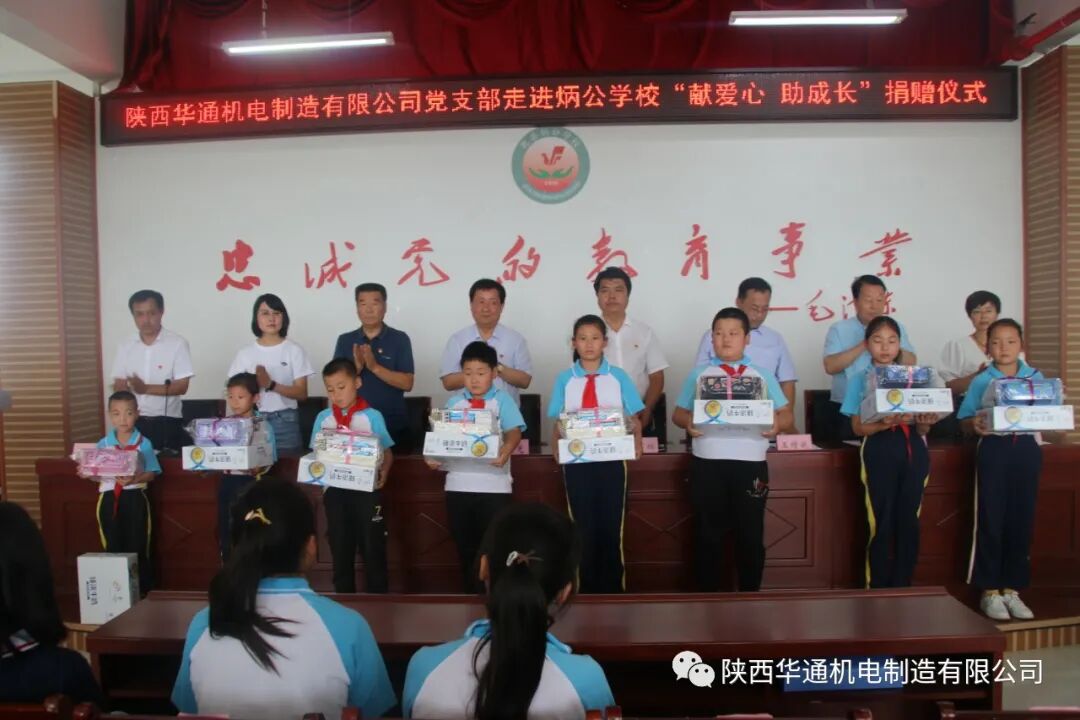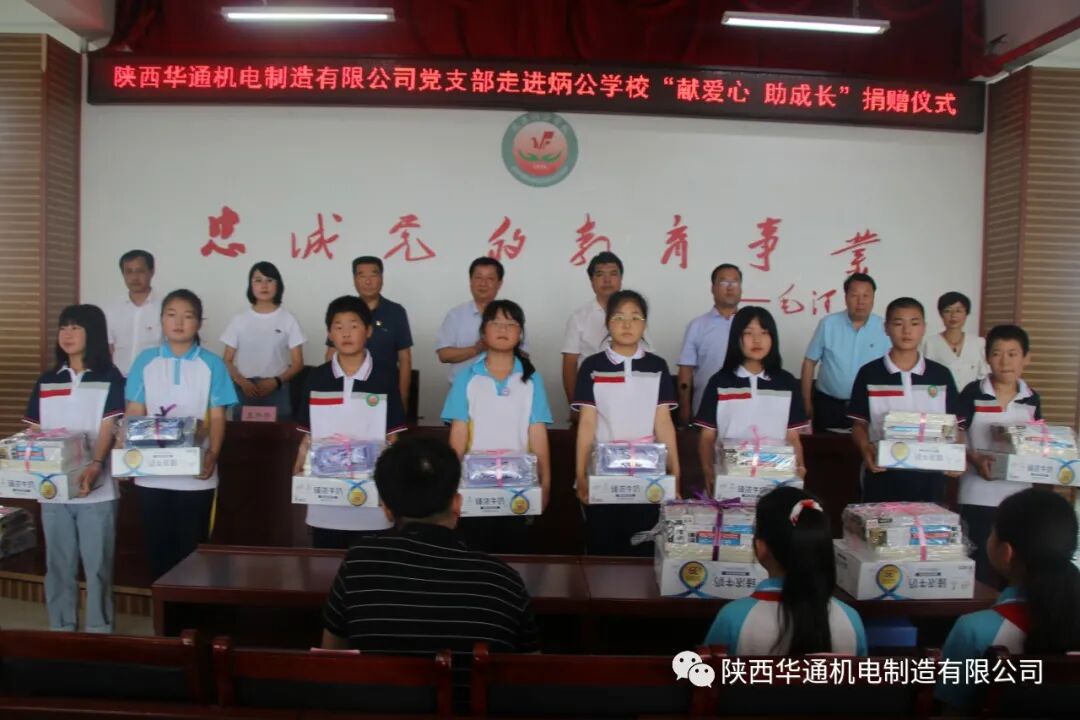 6月24日中午,炳公学校隆重召开"陕西华通机电制造有限公司走进炳公学校献爱心、助成长捐赠仪式"公司党支部向该校图书馆捐赠图书,向42名贫困户学生捐赠图书、学习用品和营养品。
