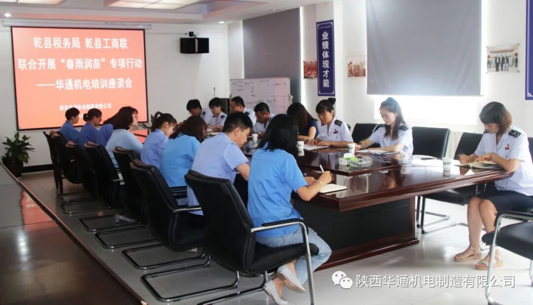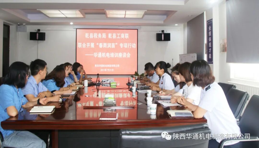 为进一步贯彻落实习近平总书记在民营企业座谈会上的重要讲话精神,全面落实《乾县2021年助力小微企业发展“春雨润苗”专项行动方案》,扎实推进“六稳”“六保”工作,2021年7月21日,乾县税务局王朝阳副局长、二分局李玮局长,工商联葛璇副主席带领税务局各科室业务骨干一行与我公司财务总监余璟、办公室副主任王珍珍、财务部全体员工召开了座谈会。
