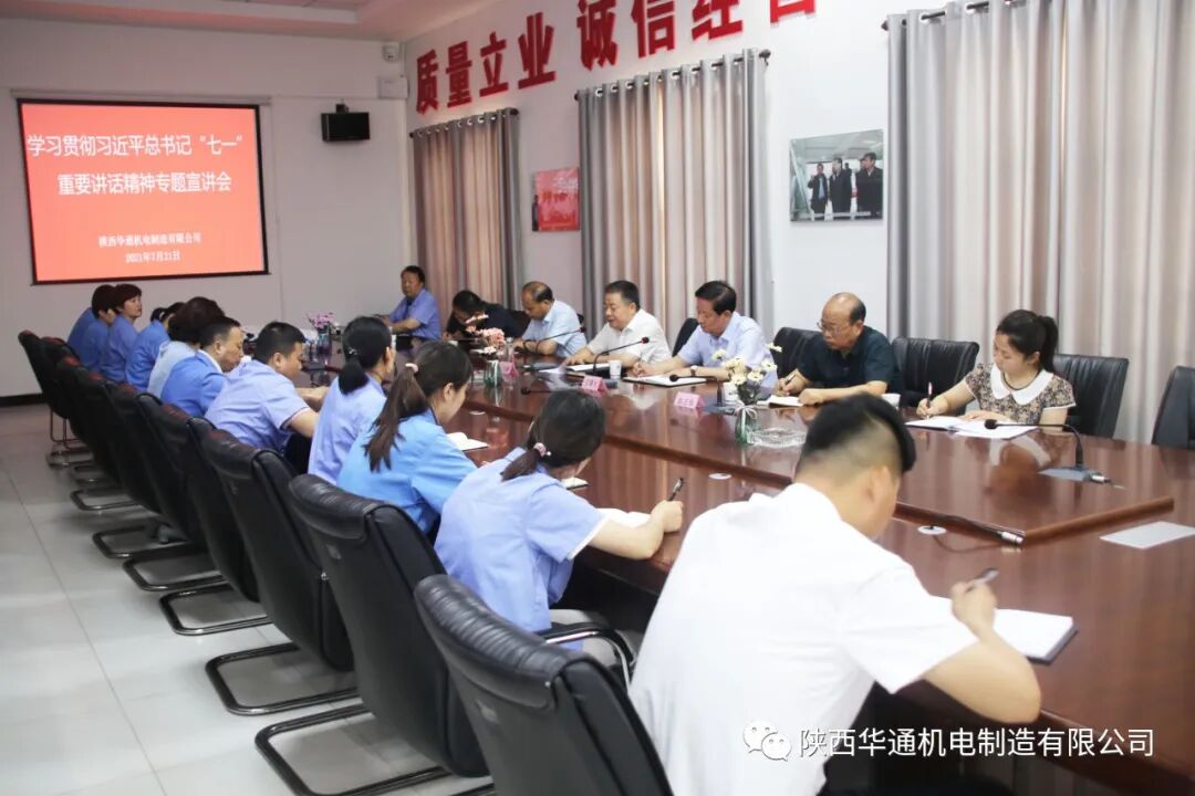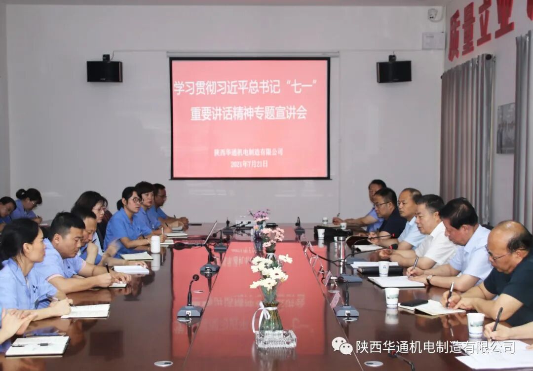 2021年7月21日,乾县县委书记焦志鹏来陕西华通机电制造有限公司宣讲习近平总书记“七一”重要讲话精神,我公司董事长王曙光主持会议,县委办主任杨飞、工信局局长高志华、园区办主任杨阳、我公司人力资源副总余璟等员工参加了会议。